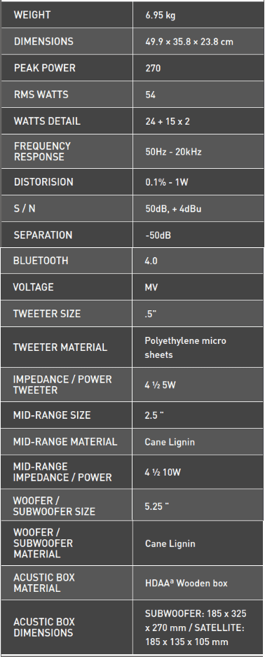 Mỗi loa vệ tinh có 2 củ loa, 1 củ loa MID và 1 củ loa TWEETER, củ loa MID hoạt động như loa trung tâm, có đường kính 2.5-inch được làm hoàn toàn từ sợi Lignin lấy từ cây mía cho khả năng trình diễn âm thanh xuất sắc. Gân loa được làm bằng cao su, giúp tối ưu sự di chuyển của cuộn dây loa.